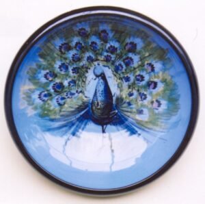 Daison Pottery bowl, 12″ diameter, decorated with a peacock on a blue background, circ 1927